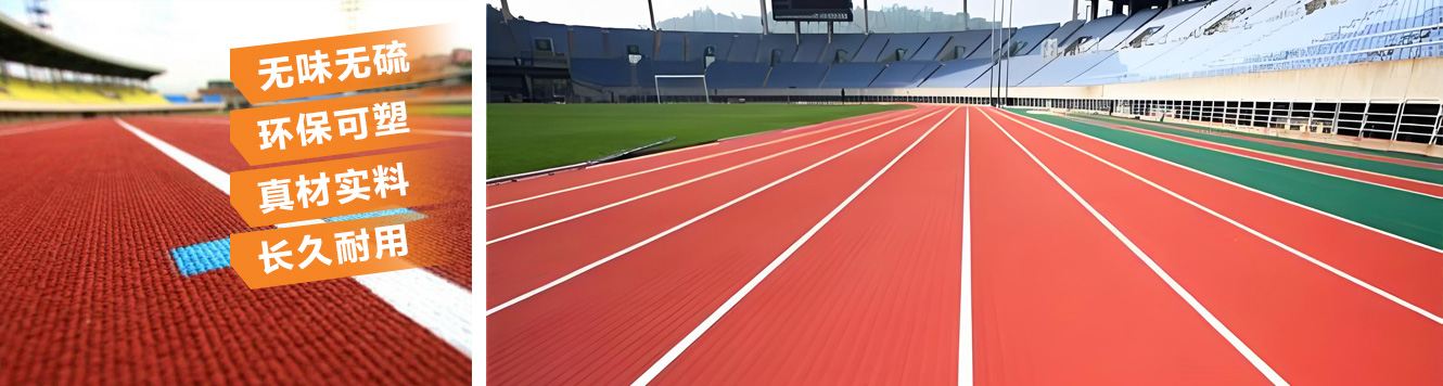 该产品使用全球公认的第三代橡胶---热塑性橡胶,经熔融、挤出、压延、冷却四道工序加工而成,无需硫化,无味合成,环保可塑。 本着真心实意、真材实料打造行业精品的理念,橡胶通体均使用高韧性、高耐候、高耐磨热塑性橡胶,坚决不使用回收材料,可确保产品全生命周期无味、无硫、环保可回收并长久耐用,橡胶使用寿命到期后仍可循环利用。产品名称 热塑预制型橡胶跑道 产品特点 无味无硫,环保可塑,长久耐用,橡胶可达到食用级别。 产品规格 长度:每卷20m;宽度:1.22m;厚度:主跑道及辅助区13mm厚,加厚区20mm厚(其中障碍水池25mm厚);颜色:红色、蓝色、绿色、可定制。 执行标准 国家强制性标准:GB 36246-2018《合成材料面层运动场地》; 国家推荐性标准:GB/T 14833-2020《合成材料运动场地面层》; 国家推荐性标准:GB/T 43564-2023《中小学合成材料面层田径场地》; 国家推荐性标准:GB/T 22517.6-2020《体育场地使用要求及检测方法 第6部分:田径场地》。 产品描述 预制型橡胶跑道采用环保可循环利用的高分子可塑性橡胶,橡胶表面为凸起纹路状耐磨层,背面为四边形气囊结构弹性层。橡胶不含任何气味、不含任何硫化物、不含杂色杂点,有害物质含量全项未检出,橡胶进场后可随机抽检橡胶材料的环保可塑性。
