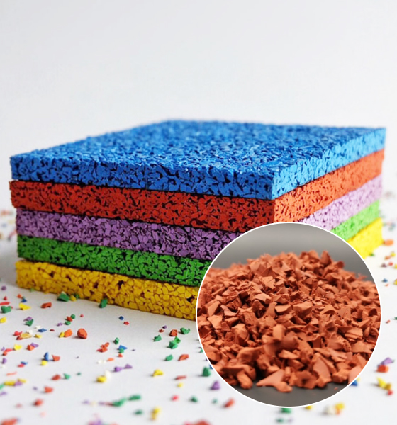 该产品使用天然橡胶与合成橡胶加工混炼、硫化、破碎而成,采用传统硫化工艺与微波硫化工艺相结合,产品生产效率高,气味较小,耐磨耐候,堆积密度小,单位体积用量小,回弹性能与抗压性能卓绝。